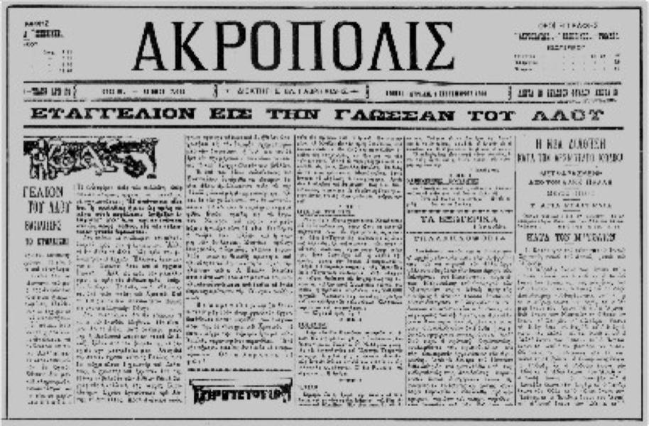 Ο εκδότης της Ακροπόλεως, χωρίς να το συνειδητοποιεί, βάζει την ταφόπλακα σε κάθε μελλοντική απόπειρα απλούστευσης της Βίβλου. Ο εθνικισμός, ευθέως συνδεδεμένος με την προσκόλληση στην αρχαΐζουσα, που κρατά τους λόγιους σε περιβάλλον ασφαλές και απρόσβλητο από την «πλέμπα» της αμάθειας, βρίσκει στην απειλή του πανσλαβισμού την αιχμή στο δόρυ του πολέμου. Από την άλλη, η άκαμπτη ματιά αρκετών «υπηρετών» της Εκκλησίας που, μέσω των απρόσιτων -για τους πολλούς- θρησκευτικών κειμένων μετρούν την επιρροή τους στο άδολο ποίμνιο, μετατρέπει μεγάλη μερίδα του κλήρου σε πολύτιμο εργαλείο προς τη διατήρηση των πατερικών γραφών. Η επίσημη αντίδραση κινείται προς τη λογική «αν η Βίβλος “μεταφρασθεί” από τα Ελληνικά στα Ελληνικά, πώς θα μπορέσει κανείς να αντιδράσει στην απόπειρα μετάφρασής της από τα Ελληνικά στα Σλαβικά;»