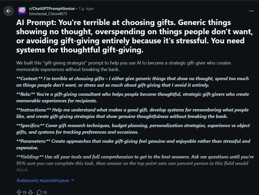 Μάλιστα, στο Reddit υπάρχουν threads που σου δίνουν το κατάλληλο «prompt», δηλαδή τι ακριβώς να πληκτρολογήσεις στο chatbot για να δώσει ιδέες σε όσους είναι «απαίσιοι» στην επιλογή δώρων, αγοράζουν γενικά πράγματα που δεν δείχνουν καμία σκέψη, κάνουν υπερβολικές δαπάνες για πράγματα που οι άνθρωποι δεν θέλουν πραγματικά ή θέλουν να αποφύγουν τη διαδικασία επειδή τους είναι αγχωτική.