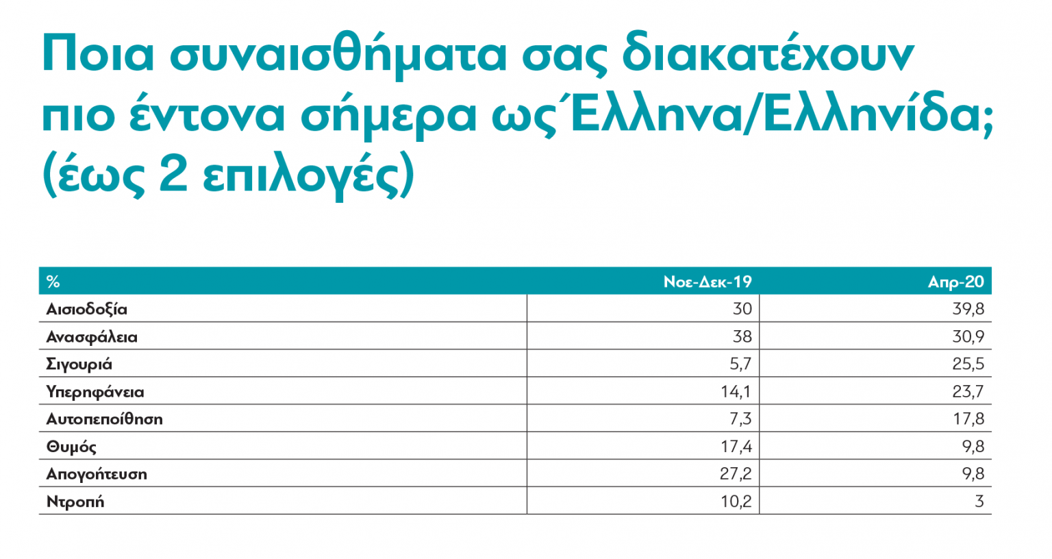 Όταν ζητήσαμε να μας πουν τα δύο κυριότερα αισθήματά τους αυτή τη στιγμή, 40% των ερωτηθέντων ανάφεραν την “αισιοδοξία” (από 30% πέντε μήνες πριν) ενώ 31% επέλεξαν την ανασφάλεια (από 38% τον Δεκέμβριο). Σήμερα πενταπλάσιοι από τότε δηλώνουν ότι νιώθουν σιγουριά, υπερδιπλάσιοι ότι νιώθουν αυτοπεποίθηση. Σχεδόν οι μισοί δηλώνουν το θυμό. Μόνο το ένα τρίτο δηλώνουν σήμερα την απογοήτευση.