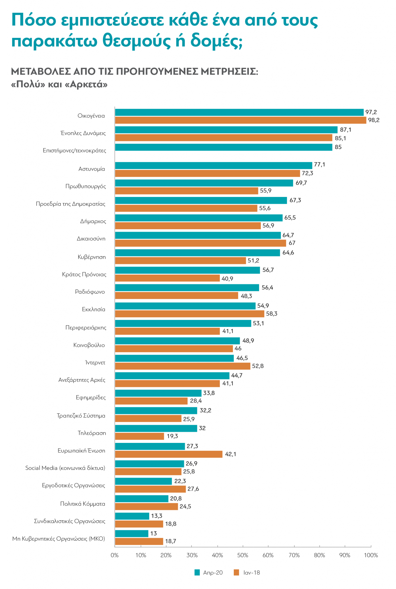 Ο μόνος θεσμός που έχει χάσει ένα μεγάλο ποσοστό από το 2018 είναι η Ευρωπαϊκή Ένωση: μόνο το 27,3% δηλώνουν ότι την εμπιστεύονται σήμερα, από 42,1% δυο χρόνια πριν.