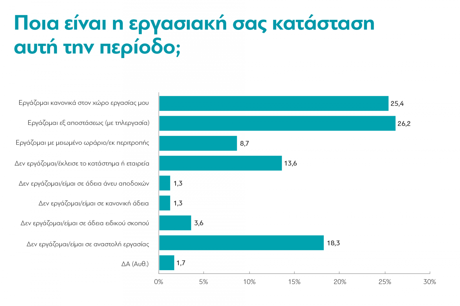 Από ό,τι φαίνεται, περίπου η μισή οικονομική δραστηριότητα στη χώρα έχει παύσει: από αυτούς που εργάζονται στην Ελλάδα, ένας στους τέσσερις (25,4%) εργάζεται κανονικά, άλλος ένας στους τέσσερις (26,2%) με τηλεργασία και οι υπόλοιποι είτε εργάζονται με μειωμένο ωράριο είτε βρίσκονται σε κάποια μορφή άδειας ή αναστολής και δεν εργάζονται καθόλου.