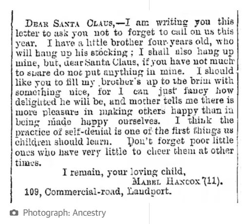 «Αγαπητέ Άγιε Βασίλη, σου γράφω αυτό το γράμμα για να σου ζητήσω να μην ξεχάσεις να μας επισκεφτείς φέτος», έγραψε η Mabel, η οποία φαίνεται να είχε μια παρόμοια σαφή αντίληψη των προτύπων αρετών που θα μπορούσαν να την βοηθήσουν να δημοσιευτεί. «Έχω έναν μικρό αδερφό τεσσάρων ετών που θα κρεμάσει την κάλτσα του. Θα κρεμάσω και τη δική μου, αλλά αγαπητέ Άγιε Βασίλη, αν δεν έχεις πολλά να μοιράσεις, μην βάλεις τίποτα στη δική μου».