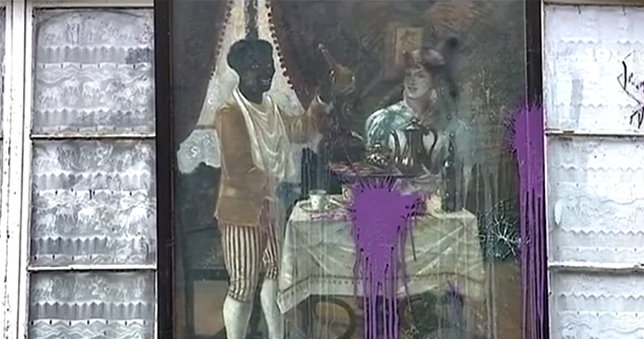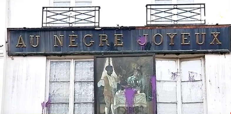 Η επίμαχη ζωγραφισμένη πινακίδα έχει αποτελέσει αντικείμενο βανδαλισμών και επαναλαμβανόμενων αντιπαραθέσεων τα τελευταία χρόνια. Δείχνει έναν μαύρο άνδρα, χαμογελαστό, να βρίσκεται στην υπηρεσία μιας λευκής κομψής κυρίας της υψηλής κοινωνίας. Πρόκειται για τον δούλο ή υπηρέτη Ζαμόρ και τη Μαντάμ ντι Μπαρί, την τελευταία αγαπημένη του βασιλιά Λουδοβίκου 15ου, που στέκονται όρθιοι μπροστά από ένα τραπέζι με γλυκίσματα και ένα σερβίτσιο στο κατάστημα “Au Negre Joyeux”, όπως αναγράφεται στο πάνω μέρος της πινακίδας.