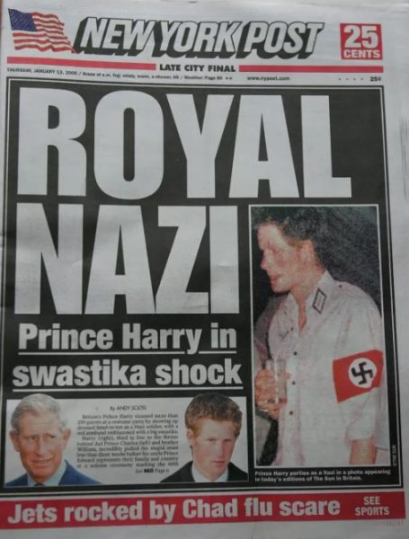 Ο πρίγκιπας Χάρι φωτογραφήθηκε φορώντας στολή στρατιώτη των Ναζί με περιβραχιόνιο σβάστικα ενώ βρισκόταν για ποτό σε ένα πάρτι ενός φίλου στις 8 Ιανουαρίου 2005.