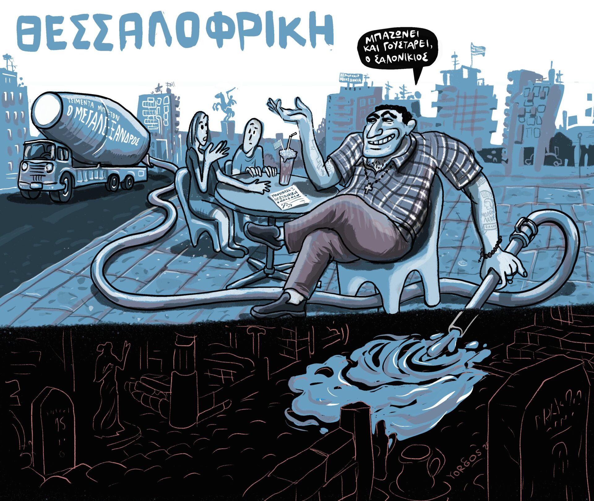 Σκίτσα οξυδερκή, σκίτσα αντισυμβατικά, σκίτσα που δεν μασάνε τα λόγια τους. Γιατί και τα σκίτσα έχουν τη δική τους γλώσσα. Αυτό πιστεύει ο Θεσσαλονικιός (ή καλύτερα κοσμοπολίτης;) εικαστικός Γιώργος Κωνσταντίνου.