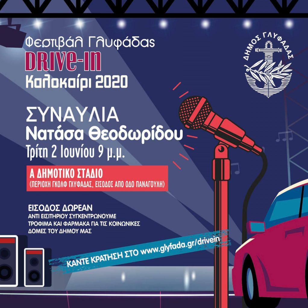 Το 1ο Drive in Φεστιβάλ είναι γεγονός! Ξεκινάμε την Τρίτη 2 Ιουνίου, στις 9 το βράδυ, με μεγάλη συναυλία της Νατάσας Θεοδωρίδου. Η αγαπημένη μας ερμηνεύτρια θα εμφανιστεί αφιλοκερδώς και θα ανοίξει τις εκδηλώσεις του Drive in Φεστιβάλ Γλυφάδας, στο Α΄ Δημοτικό Στάδιο κάτω από το Γκολφ. Παρέα της, ο μοναδικός Παντελής Καναράκης. Έτσι, οι θεατές θα έχουν την ευκαιρία να απολαύσουν τα υπέροχα τραγούδια της Νατάσας και να γελάσουν με το απίθανο χιούμορ του ταλαντούχου ηθοποιού.