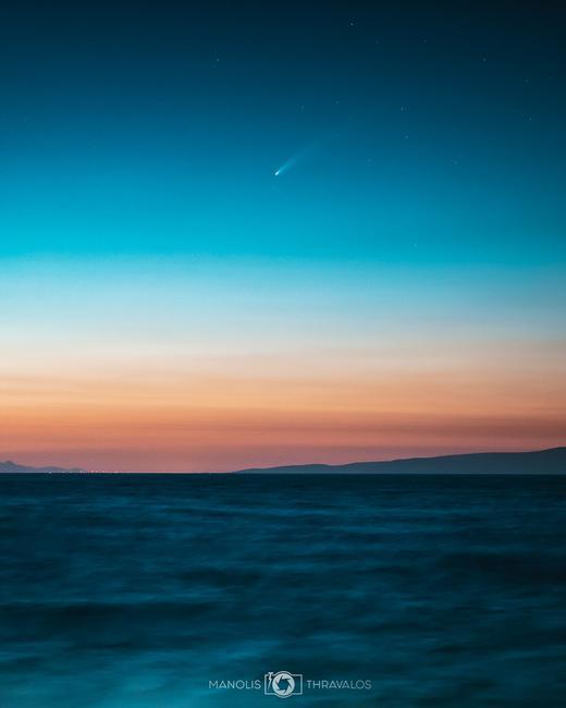Μία “μπουσταρισμένη” φωτογραφία από τον κομήτη Neowise στη Σάμο και την εξόρμηση τα ξημερώματα της 13ης Ιουλίου με δύο φίλους για ρομαντζάδα και φωτογράφιση! Οφείλω να αναφέρω, ότι η συγκεκριμένη εικόνα είναι αποτέλεσμα εικαστικής παρέμβασης. Στις 05:11 που βγήκε αυτό το κάδρο, μόλις που μπορούσαμε να διακρίνουμε τον κομήτη μέσα στο λυκαυγές. Η προσθήκη του κομήτη σε αυτήν την περίπτωση έγινε από λήψεις που βγήκαν περίπου μισή ώρα πριν, σε μία προσπάθεια να ολοκληρώσω το υλικό που θα έδινα στα παιδιά που με βοήθησαν με αυτήν τη φωτογράφιση τη Δευτέρα τα ξημερώματα.