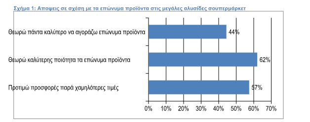 Σημειώνεται ότι η ποιοτική εικόνα των προϊόντων αυτών έχει βελτιωθεί τα τελευταία χρόνια και η πλειοψηφία των ερωτηθέντων σε ποσοστό 58% θεωρεί ότι τα προϊόντα ιδιωτικής ετικέτας είναι εξίσου ποιοτικά σε σχέση με τα αντίστοιχα επώνυμα προϊόντα.