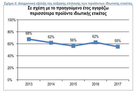 Παράλληλα με αυτά τα δεδομένα όμως η πλειοψηφία των καταναλωτών εξακολουθεί να αυξάνει τον αριθμό προϊόντων ιδιωτικής ετικέτας που δοκιμάζει-επιλέγει (σχήμα 2), αλλά με φθίνοντα ρυθμό.