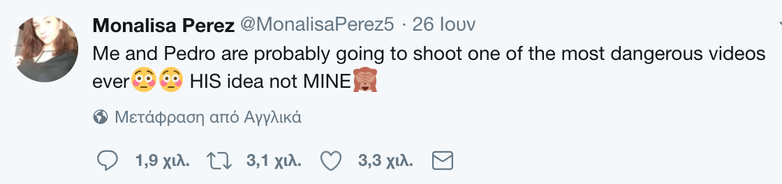 «Ο Πέδρο κι εγώ θα καταγράψουμε πιθανόν ένα από τα πιο επικίνδυνα βίντεο που έχουν γυριστεί ποτέ», έγραψε η νεαρή γυναίκα την ίδια μέρα στον λογαριασμό της στο Twitter. «ΔΙΚΗ ΤΟΥ ιδέα, όχι ΔΙΚΗ ΜΟΥ».