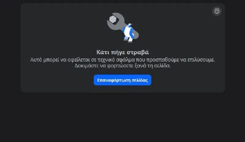 Σε πολλούς χρήστες που επιχειρούν να “φορτώσουν” την αρχική σελίδα στο Facebook, βγάζει το εξής μήνυμα: “Κάτι πήγε στραβά. Αυτό μπορεί να οφείλεται σε τεχνικό σφάλμα που προσπαθούμε να επιλύσουμε. Δοκιμάστε να φορτώσετε ξανά τη σελίδα”.