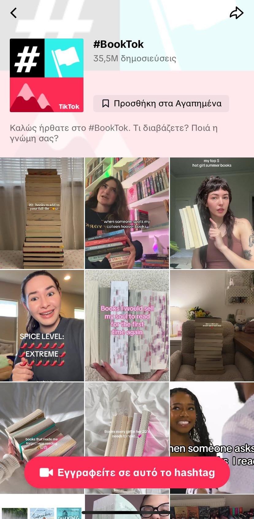 “Καλώς ήρθατε στο #BookTok. Τι διαβάζετε; Ποια η γνώμη σας;” είναι η εισαγωγική καρτέλα στην ετικέτα #BookTok, το οποίο αριθμεί 35,5 εκατομμύρια αναρτήσεις. Το #BookTok αυτή τη στιγμή αποτελεί τη μεγαλύτερη “λέσχη βιβλίου” στον κόσμο.