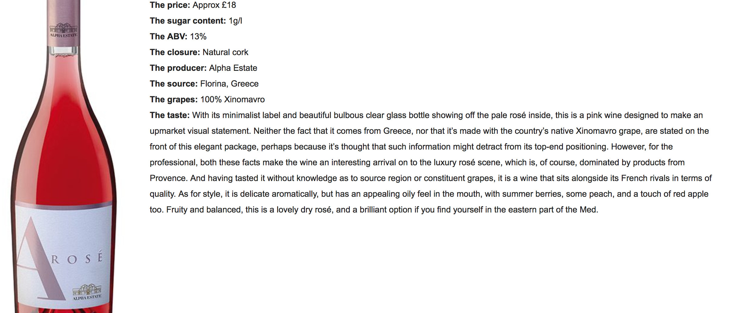 Έτσι λοιπόν μέσα στη λίστα με τα καλύτερα ροζέ κρασιά του κόσμου, που ένας πότης πρέπει να δοκιμάσει πριν φύγει από το μάταιο τούτο κόσμο, συμπεριέλαβαν, ένα κρασί από το Αμύνταιο της Φλώρινας, το Ροζέ του Κτήματος Άλφα του Άγγελου Ιατρίδη .
