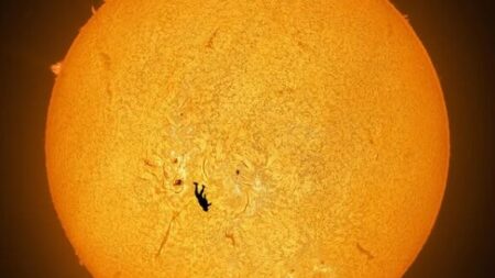 Ένας αστροφωτογράφος στην Αριζόνα κατέγραψε μια εικόνα που μοιάζει σχεδόν απίστευτη: έναν YouTuber σε ελεύθερη πτώση να ευθυγραμμίζεται με τη φλογερή επιφάνεια του Ήλιου, δημιουργώντας την εντύπωση ότι κατρακυλά στο κενό του διαστήματος μπροστά από το άστρο μας. Η φωτογραφία, με τον εύγλωττο τίτλο «Η Πτώση του Ίκαρου», δημιουργεί την ψευδαίσθηση ότι ο εναέριος ακροβάτης διασχίζει τον ηλιακό δίσκο και είναι αποτέλεσμα σχολαστικού και πολυήμερου σχεδιασμού.