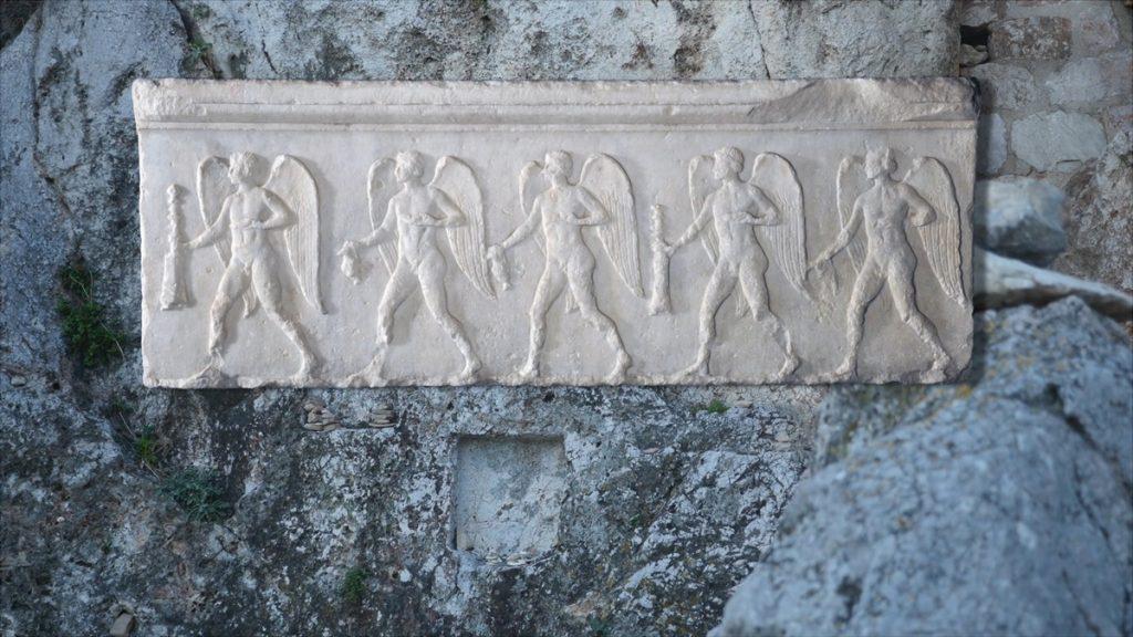 Στο σπήλαιο -το προτελευταίο βορειοανατολικά, πριν από αυτό του Πάνα- της βόρειας κλιτύος της Ακρόπολης, οι αρχαιολόγοι εντόπισαν θραύσματα επιγραφών, γλυπτών, αγγείων και δύο μαρμάρινες ζωφόρους με ανάγλυφη πομπή φτερωτών Ερώτων…