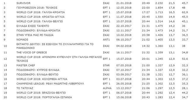 Τα 20 προγράμματα με τη μεγαλύτερη τηλεθέαση το 2018