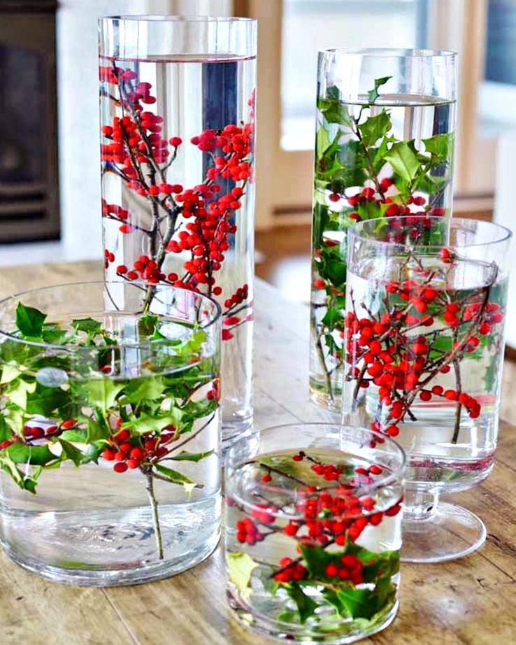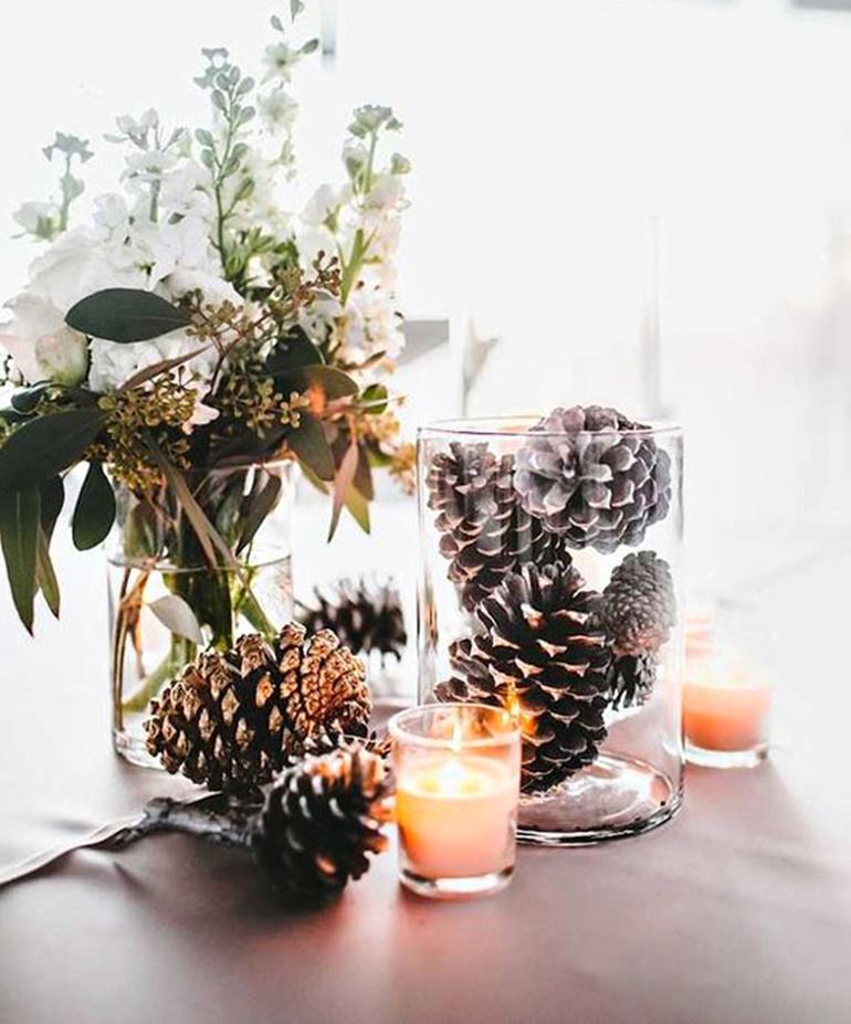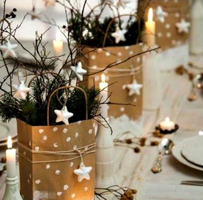 Απλά διάφανα βάζα σε διαφορετικά μεγέθη, μπορεί να είναι και μόνο δύο, γεμάτα νερό και γκι στο εσωτερικό τους. Επίσης χριστουγεννιάτικη ιδέα, μερικές πευκοβελόνες σε νερό ή σε μικροσκοπικές χάρτοσακούλες όπως θα δείτε παρακάτω. Μπορείτε για περισσότερο όγκο να τις γεμίσετε με κλωναράκια από κυπαρίσσια και να προσθέσετε με σπάγκο και ένα πολύ απλό δέσιμο, ένα μικρό στολίδι.