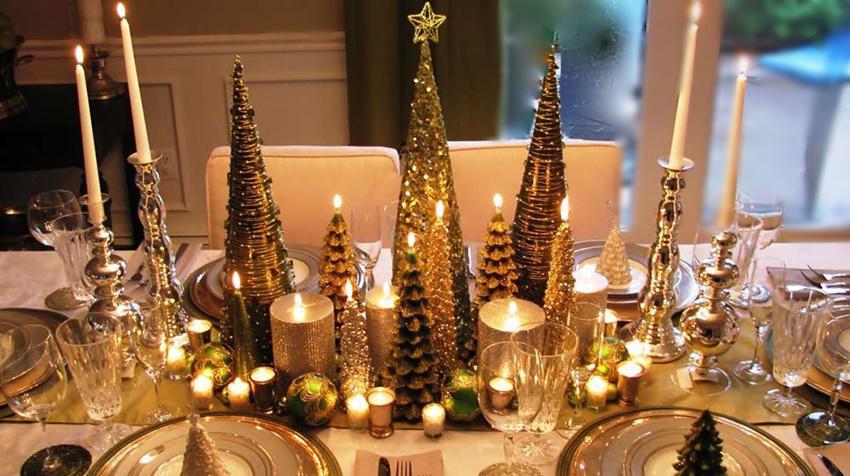 Ένα δάσος από χρυσά κεριά. Κεριά, πολλά κεριά. Σε διαφορετικά μεγέθη και έντονα χρώματα. Εδώ θα δείτε την εκδοχή του χρυσού, αλλά ως ιδέα μπορεί να υλοποιηθεί και με την σύνθεση διαφορετικών κηροπήγιων και ρεσώ για να χαρίσουν την αίσθηση του πολυεπίπεδου.