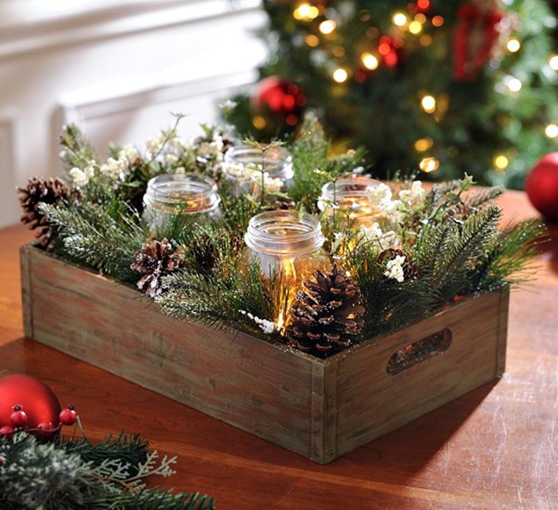 Μπορείτε σε ένα καφάσι, ή ένα παλιό καλάθι αξιοποιώντας άδεια βάζα, να τοποθετήσετε πολύ απλά ένα κερί στο εσωτερικό, λίγες κουκουνάρες και μερικά κλαδιά από το παλιό σας δέντρο και είστε έτοιμοι.