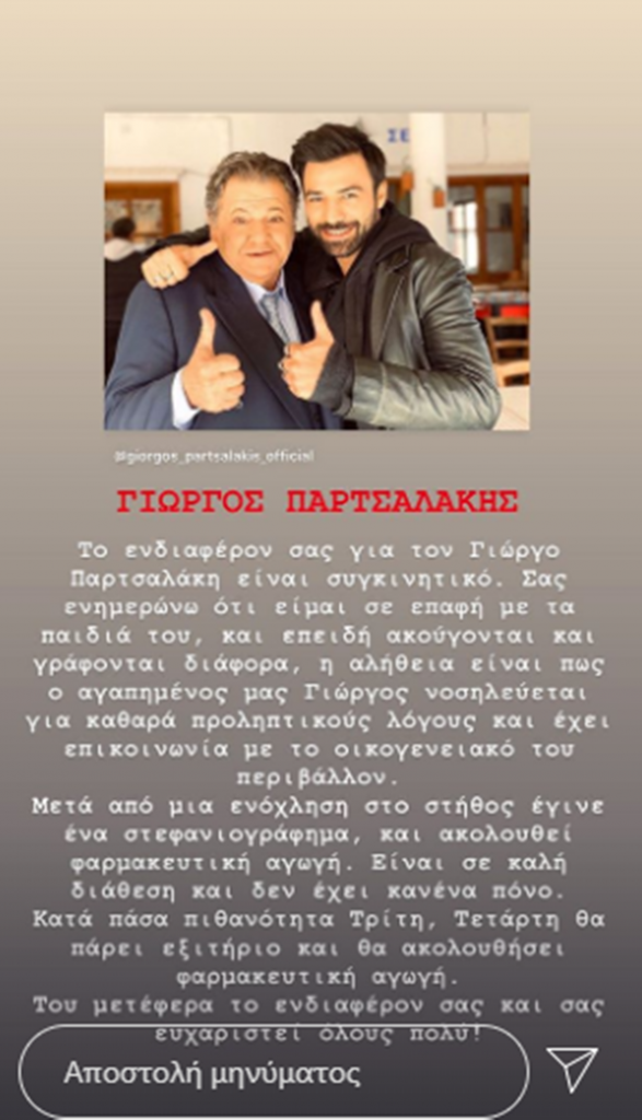 “Το ενδιαφέρον σας για τον Γιώργο Παρτσαλάκη είναι συγκινητικό. Σας ενημερώνω ότι είμαι σε επαφή με τα παιδιά του, και επειδή ακούγονται και γράφονται διάφορα, η αλήθεια είναι πως ο Γιώργος μας νοσηλεύεται για καθαρά προληπτικούς λόγους και έχει επικοινωνία με το οικογενειακό του περιβάλλον. Μετά από μια ενόχληση στο στήθος έγινε στεφανιογράφημα, και ακολουθεί φαρμακευτική αγωγή. Είναι σε καλή διάθεση και δεν έχει κανένα πόνο. Κατά πάσα πιθανότητα Τρίτη, Τετάρτη θα πάρει εξιτήριο και θα ακολουθήσει φαρμακευτική αγωγή. Του μετέφερα το ενδιαφέρον σας και σας ευχαριστεί όλους πολύ”