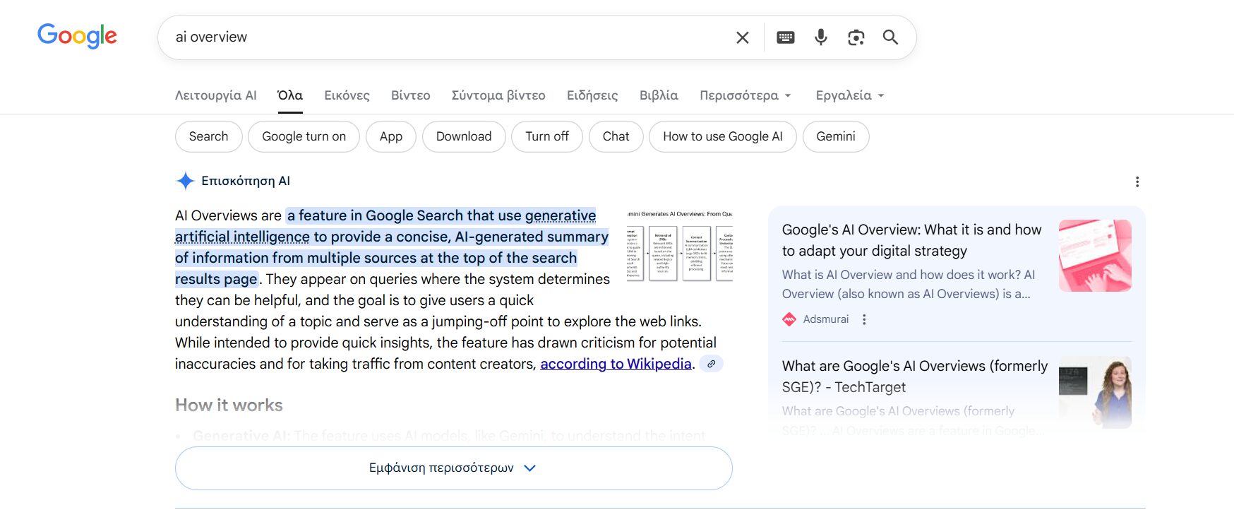 Πλέον, δεν χρειάζεται να κάνεις το «κλικ», να ψάξεις την πληροφορία μέσα σε ένα ολόκληρο άρθρο, καθώς η απάντηση σου «σερβίρεται» στο πιάτο από την Τεχνητή Νοημοσύνη, μέσα σε ένα πλαίσιο κειμένου, το οποίο συνοψίζει το αποτέλεσμα της αναζήτησής σου.