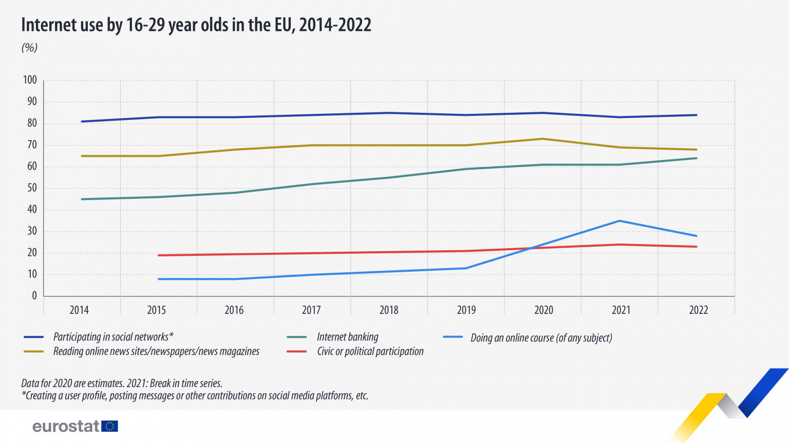 Το 2022, μόνο το 23% των νέων χρησιμοποίησε το Διαδίκτυο για συμμετοχή στα κοινά ή για πολιτική, δραστηριότητα που έχει σημειώσει μικρή αύξηση από το 2015.