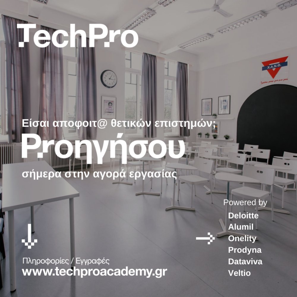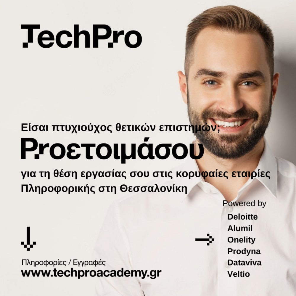 Η απόκριση λοιπόν είναι θετική και άμεση. Η πρόσκληση του Tech Pro Academy προς απόφοιτ@ς θετικών σχολών που επιδιώκουν την ένταξή τους στον κλάδο είναι ανοιχτή και αναμένει να επανεκπαιδεύσει το κατάλληλο ανθρώπινο δυναμικό με σκοπό την άμεση απορρόφηση από τις μεγαλύτερες της πόλη μας.