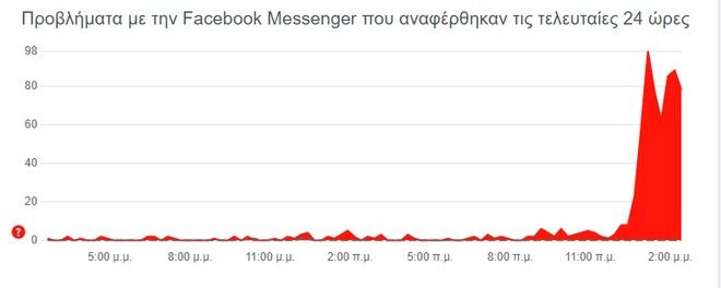 Σύμφωνα με το Downdetector, την τελευταία ώρα πάνω από 200 χρήστες έχουν αναφέρει προβλήματα στο Messenger, κυρίως στην αποστολή μηνυμάτων, ενώ πάνω από 70 αναφέρουν ότι αντιμετωπίζουν πρόβλημα τόσο στην ιστοσελίδα όσο και στην εφαρμογή του Facebook.