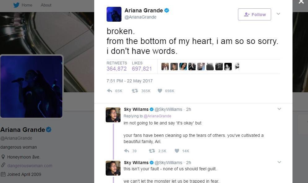 “Φαίνεται ότι οι βόμβες της βρετανικής πολεμικής αεροπορίας με στόχο παιδιά στη Μοσούλη και στη Ράκα μόλις επέστρεψαν στο #Mάντσεστερ”, έγραψε ένας χρήστης ονόματι Άμπντουλ Χακ στο Twitter αναφερόμενος στις πόλεις του Ιράκ και της Συρίας, που βρίσκονται υπό τον έλεγχο των τζιχαντιστών, όπου ο υπό τις ΗΠΑ συνασπισμός, του οποίου μέλος είναι και η Βρετανία, πραγματοποιεί αεροπορικούς βομβαρδισμούς.
