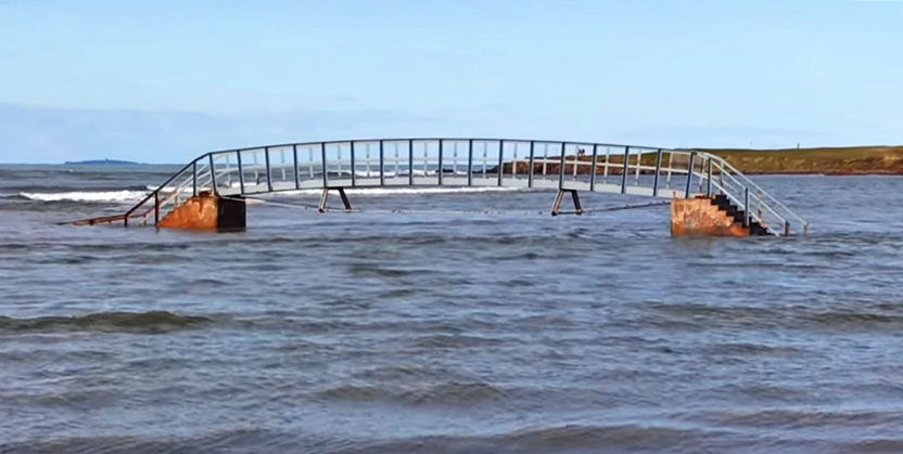 Πριν εκβάλλει στη Βόρεια Θάλασσα, περνάει κάτω από μια μεταλλική πεζογέφυρα με τσιμεντένιες βάσεις και βαθμίδες. Όταν η παλίρροια είναι χαμηλή, από αυτή τη γέφυρα περνάς στην απέναντι όχθη. Όταν, όμως, δεν είναι χαμηλή, η στεριά από τη μια και την άλλη μεριά της πεζογέφυρας καλύπτεται απ’ τα νερά.