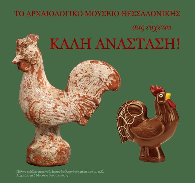 Ένας αρχαίος κόκορας (πήλινο ειδώλιο πετεινού απ την αρχαία Άκανθο του 4ου π.Χ αιώνα – μαζί κι ένας μικρότερος από σοκολάτα, ένα κλαδί με άνθη ροζ μυγδαλιάς- ζωγραφισμένη, “ιδιόχειρα ζωγραφισμένη” από την αποστολέα , η ελπίδα πως “τίποτα δεν θα σταματήσει την Άνοιξη” σε κείμενο που “λερώνει” το φόντο μιας μοναδικής κατακόκκινης παπαρούνας , γιατροί με λευκές νοσοκομειακές ποδιές πιασμένοι χέρι – χέρι με πολύχρωμους (στο δέρμα και τα ρούχα) πολίτες χορεύουν στον κύκλο της ζωής.