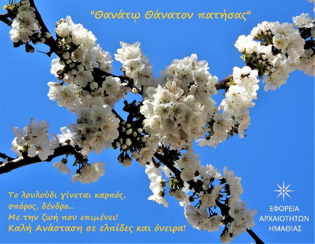 Ας κρατήσουμε -παρά τη ζοφερότητα κι αυτού του “σκληρού Απρίλη του 2020” την ελπίδα πως «Οι Πασχαλιές – θ’ ανθίσουν και φέτος “και όπως εύχεται η κάρτα της Εφορείας Αρχαιοτήτων Ημαθίας : “Καλή ανάσταση σε ελπίδες και όνειρα”.