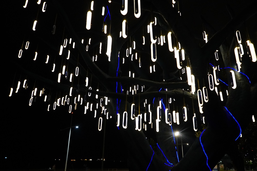 Το πρωί μοιάζει με ξερό δέντρο, από τα κλαδιά του οποίου κρέμονται περίεργοι «καρποί». Το βράδυ, όμως, οι ασυνήθιστοι «καρποί» φωτίζονται κάνοντας την εικόνα του δέντρου ιδιαίτερα εντυπωσιακή.