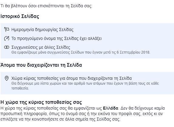 Από εκείνη την ημερομηνία, λοιπόν, και έπειτα, όσοι επισκέπτονται Σελίδες θα βλέπουν επιπλέον πληροφορίες στην ενότητα «Πληροφορίες και διαφημίσεις». Θα περιλαμβάνεται σε αυτές η ημερομηνία δημιουργίας του page και οι τοποθεσίες χωρών όπου έχουν τη βάση τους οι διαχειριστές.