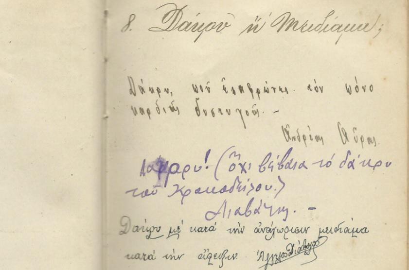 – Το μόνο που διασκεδάζει είναι η μοναξιά / Κείναις που για την ψυχή μου είναι αρμονία και γιατρεύουν τις πληγαίς της / Τον αρμονικόν ήχον του παθητικού βιβλίου.
