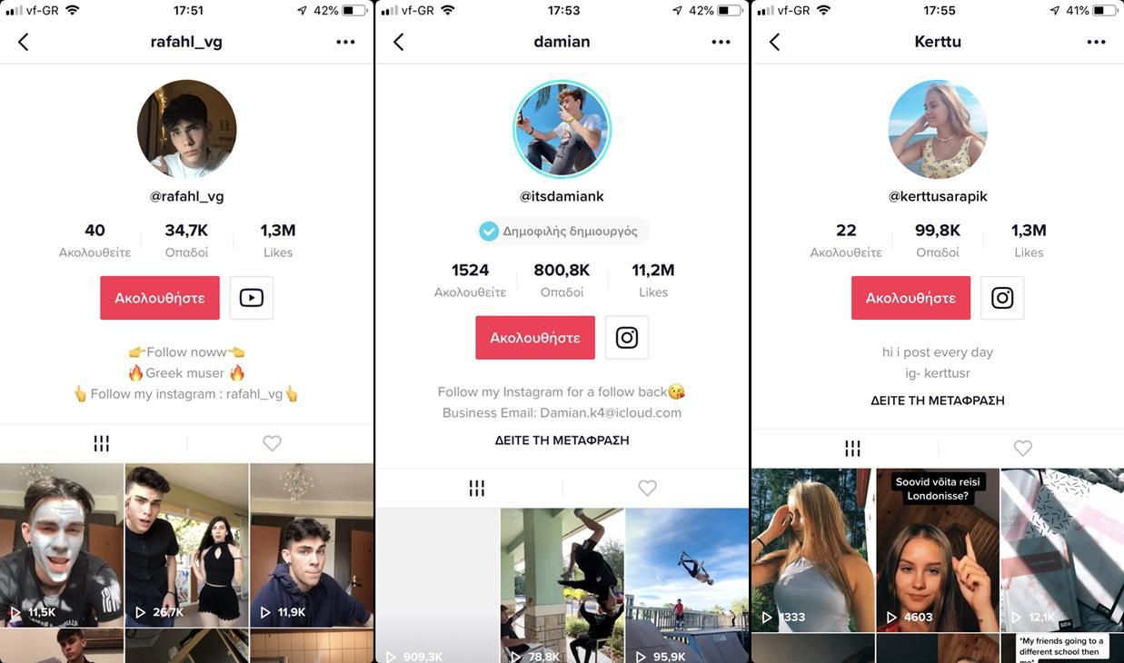 Η Ελλάδα δεν είναι μια μεγάλη αγορά, όμως ό,τι συμβαίνει παγκοσμίως φτάνει αμέσως και στην χώρα μας. Υπάρχουν και εδώ οι μικροί σταρ του TikTok με χιλιάδες ακόλουθους. Οι Έλληνες χρήστες συνήθως δημιουργούν βίντεο όπου τραγουδούν ραπ και τραγούδια των σύγχρονων σταρ όπως Sin Boy, Snik, ενώ ιδιαίτερα δημοφιλή είναι και τα σκετσάκια από ατάκες ελληνικών ταινιών και σειρών όπως το Ντόλτσε Βίτα, Παρά Πέντε, Εγκλήματα.
