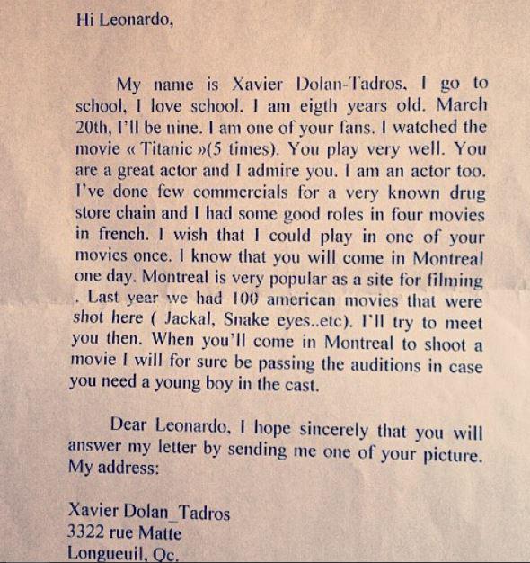 «Είδα την ταινία “Τιτανικός” -5 φορές. Παίζεις πολύ καλά. Είσαι ένας σπουδαίος ηθοποιός και σε θαυμάζω» έγραφε ο Ξαβιέ Ντολάν στο γράμμα.