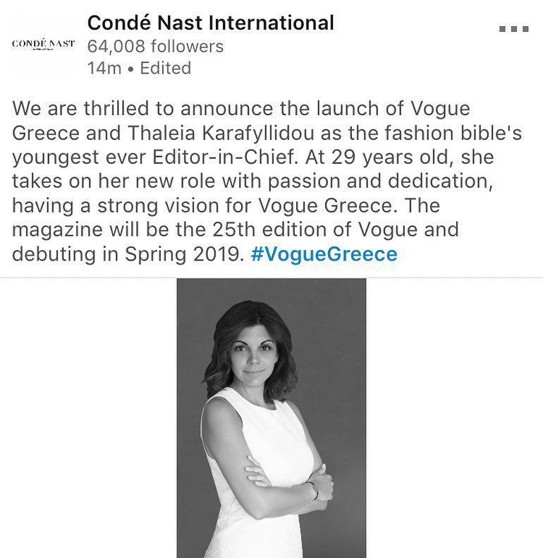 Έτσι λοιπόν ετοιμάζεται και θα λανσαριστεί το 2019 στην αγορά της Ελλάδας η Vogue Hellas. Στο τιμόνι της η νεώτερη διευθύντρια έκδοσης στην ιστορία του περιοδικού. Η Θεσσαλονικιά Θάλεια Καραφυλλίδου. Η ανακοίνωση είναι πανηγυρική.
