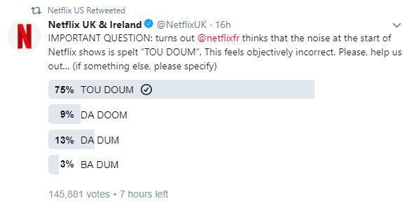 IMPORTANT QUESTION: turns out @netflixfr thinks that the noise at the start of Netflix shows is spelt “TOU DOUM”. This feels objectively incorrect. Please, help us out… (if something else, please specify)