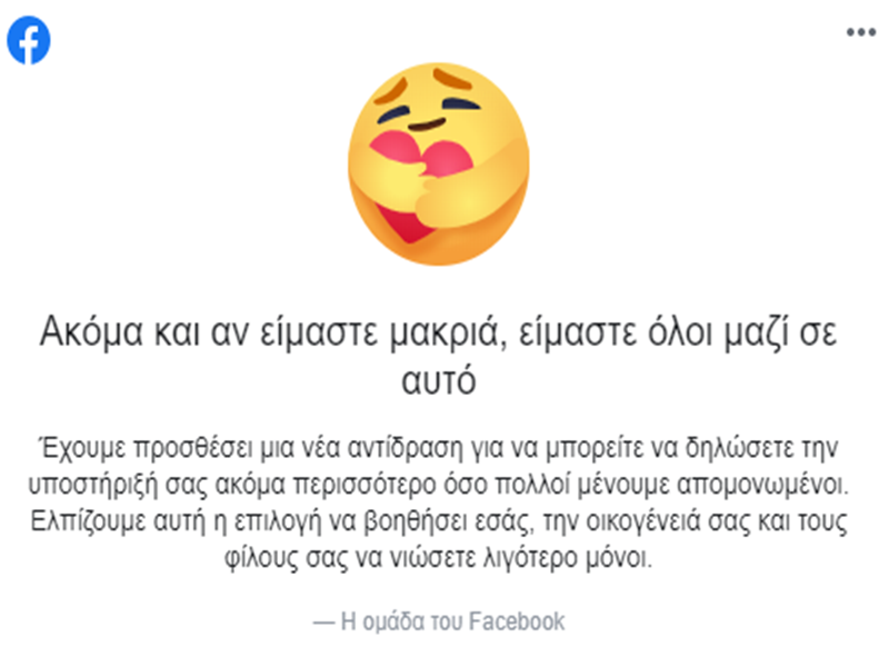 Ένα νέο emoji μπορούν να χρησιμοποιούν από σήμερα οι χρήστες του Facebook, προκειμένου να δείχνουν εν μέσω πανδημίας ότι νοιάζονται καθώς και ότι δείχνουν υποστήριξη σε αυτήν την δύσκολη περίοδο.