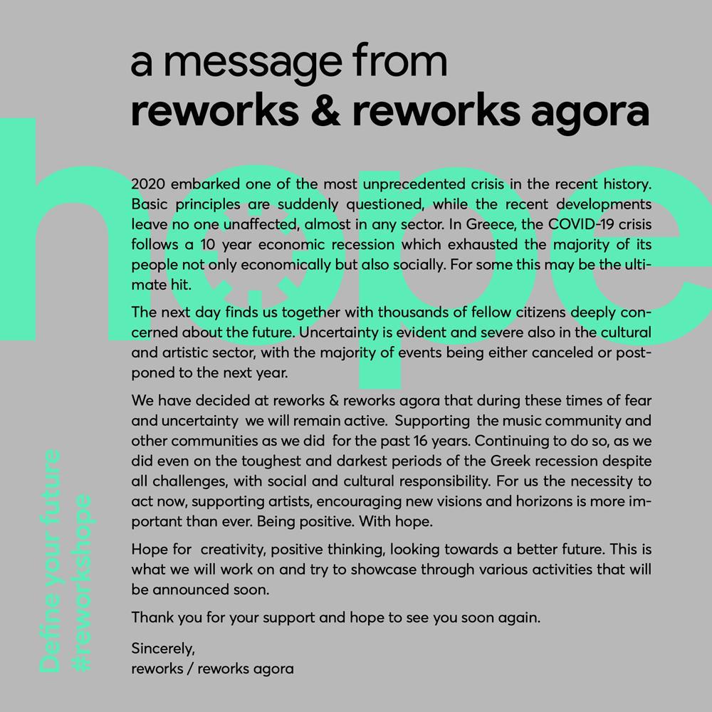 Έχοντας ως βασική αρχή την κοινωνική αλλά και πολιτιστική ευθύνη σε μια περίοδο που κυριαρχεί ο φόβος και η αβεβαιότητα, reworks & reworks agora θα είναι παρόντες όπως κάθε χρονιά τον Σεπτέμβρη, προσδοκώντας με τις δράσεις μας να ενθαρρύνουμε την ελπίδα. Ελπίδα για ένα καλύτερο κόσμο, με περισσότερη δημιουργία, θετική σκέψη, προσδοκώντας σε ένα μέλλον καλύτερο από το σημερινό. Αυτό θα επιχειρήσουμε να προβάλλουμε μέσα από δράσεις που θα ανακοινωθούν σύντομα, με την ελπίδα να ενθαρρύνουμε και άλλες διοργανώσεις να πράξουν το ίδιο.