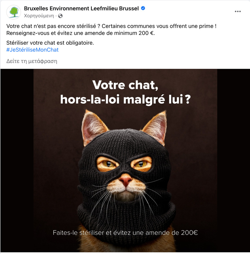 Εδώ και μερικές ημέρες η Υπηρεσία Περιβάλλοντος της Περιφέρειας https://environnement.brussels/citoyen/lenvironnement-bruxelles/veiller-au-bien-etre-animal/sterilisez-et-identifiez-votre-chat-pour-son-bien-etre-et-sa-securite ξεκίνησε τη νέα καμπάνια ενημέρωσης για το πρόγραμμα στείρωσης με μια προβοκατόρικη φωτογραφία του γάτου – τρομοκράτη.