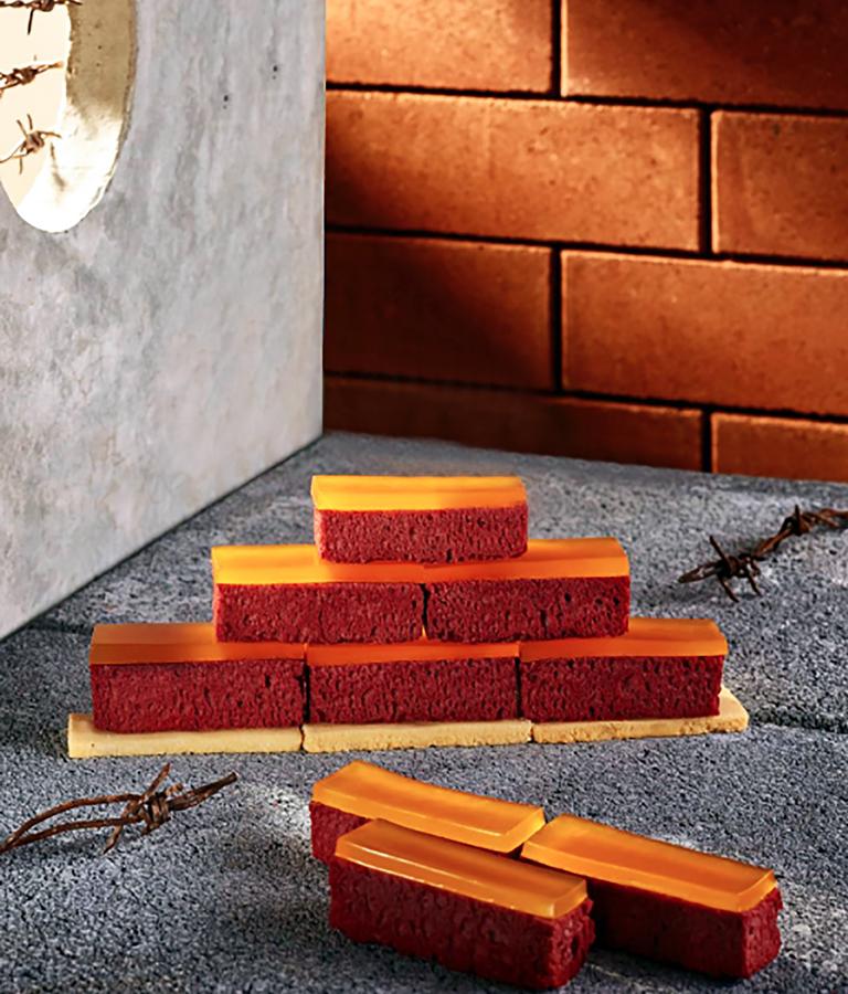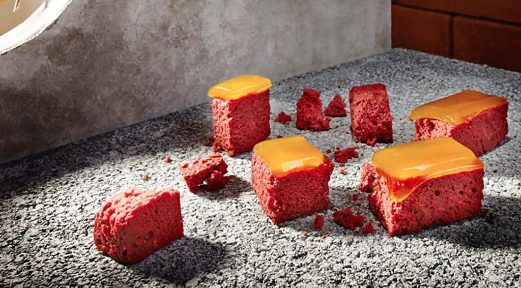 Η αρχιτεκτονική εκδοχή που επιδέχεται σήμερα το red velvet cake, μιμείται τα αρχιτεκτονικά οικοδομικά στοιχεία της γενέτειράς του, της Αμερικής, καθώς παίρνει έμπνευση από την κατασκευή των κεντρικών αμερικανικών Lofts, στο Soho του Μανχάταν, αλλά και από τους κλασικούς Νεοϋορκέζικους φούρνους, στους οποίους το κόκκινο πυρότουβλο αποτελεί βασικό στοιχείο του design και της κατασκευής. Έτσι το γλυκό επιμερίζεται σε ορθογώνια κομμάτια, ενώ η επιφάνεια επικαλύπτεται με ένα ζελαρισμένο πουρέ φρούτων του πάθους και μάνγκο, το οποίο μιμείται το ρόλο της συνδετικής τσιμεντοκονίας των τούβλινων τεμαχίων, κατά την κατασκευή μιας τοιχοποιίας.