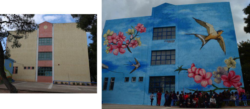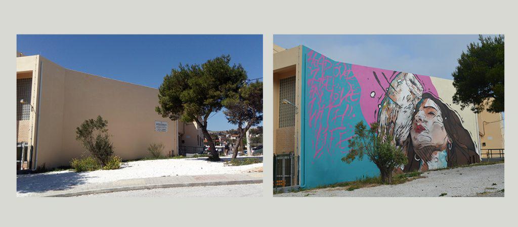 Οι παρεμβάσεις υλοποιήθηκαν στο Δημοτικό Αγίας Μαρίνας, στο Νηπιαγωγείο Αγίας Μαρίνας και στο 1ο Επαλ Ραφήνας. Όλες οι τοιχογραφίες έδωσαν μια νότα χρωματικής “ανάσας” στους μαθητές-τριες, στη σχολική κοινότητα αλλά και στην ευρύτερη περιοχή, με θέματα συμβολικά: Η τοιχογραφία στο Δημοτικό αποτυπώνει την άνοιξη-ελπίδα, η τοιχογραφία στο Νηπιαγωγείο μια πανδαισία χρωμάτων και γεωμετρικών σχημάτων και η τοιχογραφία στο Επαλ που “βλέπει” στην Λεωφ. Μαραθώνος, μια σαφή αναφορά στη φύση: μια γυναικεία φιγούρα-σύμβολο της μητέρας φύσης και μια κουκουβάγια-σύμβολο της γνώσης. Ζωγραφισμένα όλα μέσα από το ιδιαίτερο στυλ και την χρωματική παλέτα του εκάστοτε καλλιτέχνη.