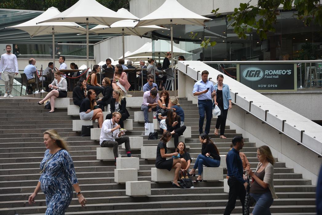 Όπως στις περισσότερες μεγαλουπόλεις του δυτικού κόσμου, έτσι και εκεί μεταξύ 12 με 2 το μεσημέρι περίπου, χιλιάδες υπάλληλοι ξεχύνονται έξω, για το καθιερωμένο μεσημεριανό γεύμα ή lunch για τους αγγλομαθείς.