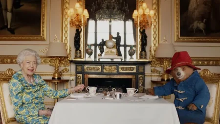 Οι δυο τους κάθισαν μαζί για ένα φλυτζάνι τσάι και κατέληξαν να χτυπούν τα αργυρά μαχαιροπήρουνά τους ρυθμικά στον παλμό του «We Will Rock You». Στη συνέχεια, βλέπουμε τον Πάντινγκτον να σηκώνει το καπέλο του δείχνοντάς της το δικό του σάντουιτς μαρμελάδας και να την «ευχαριστεί για όλα», με την μονάρχη να λέει ότι το δικό της «το κρατάει για αργότερα».