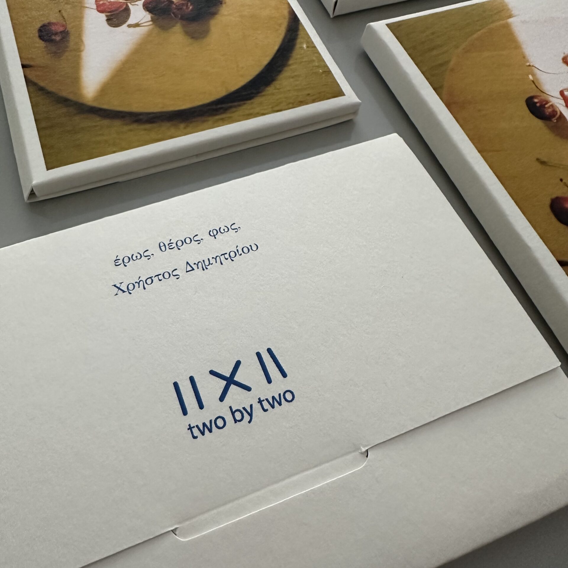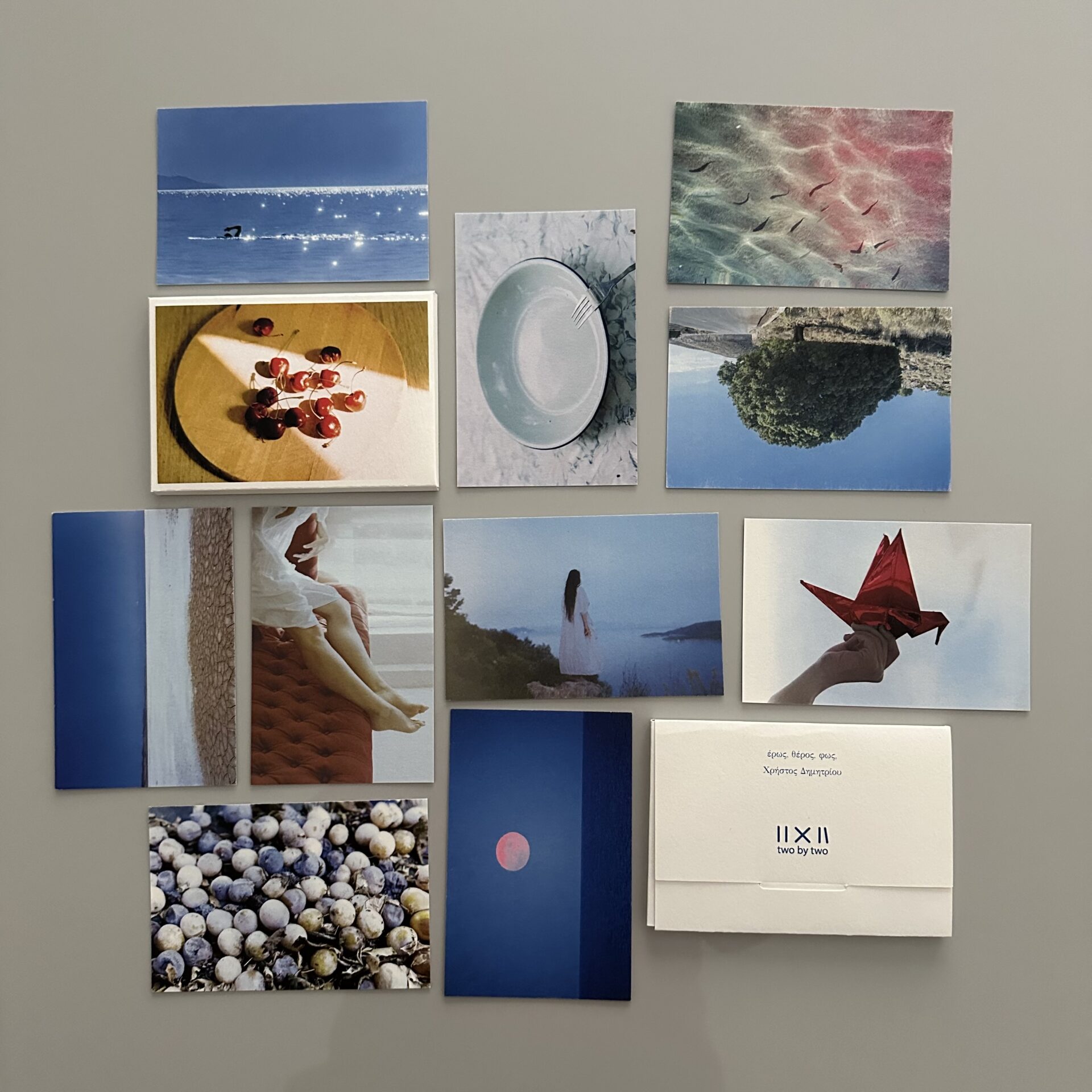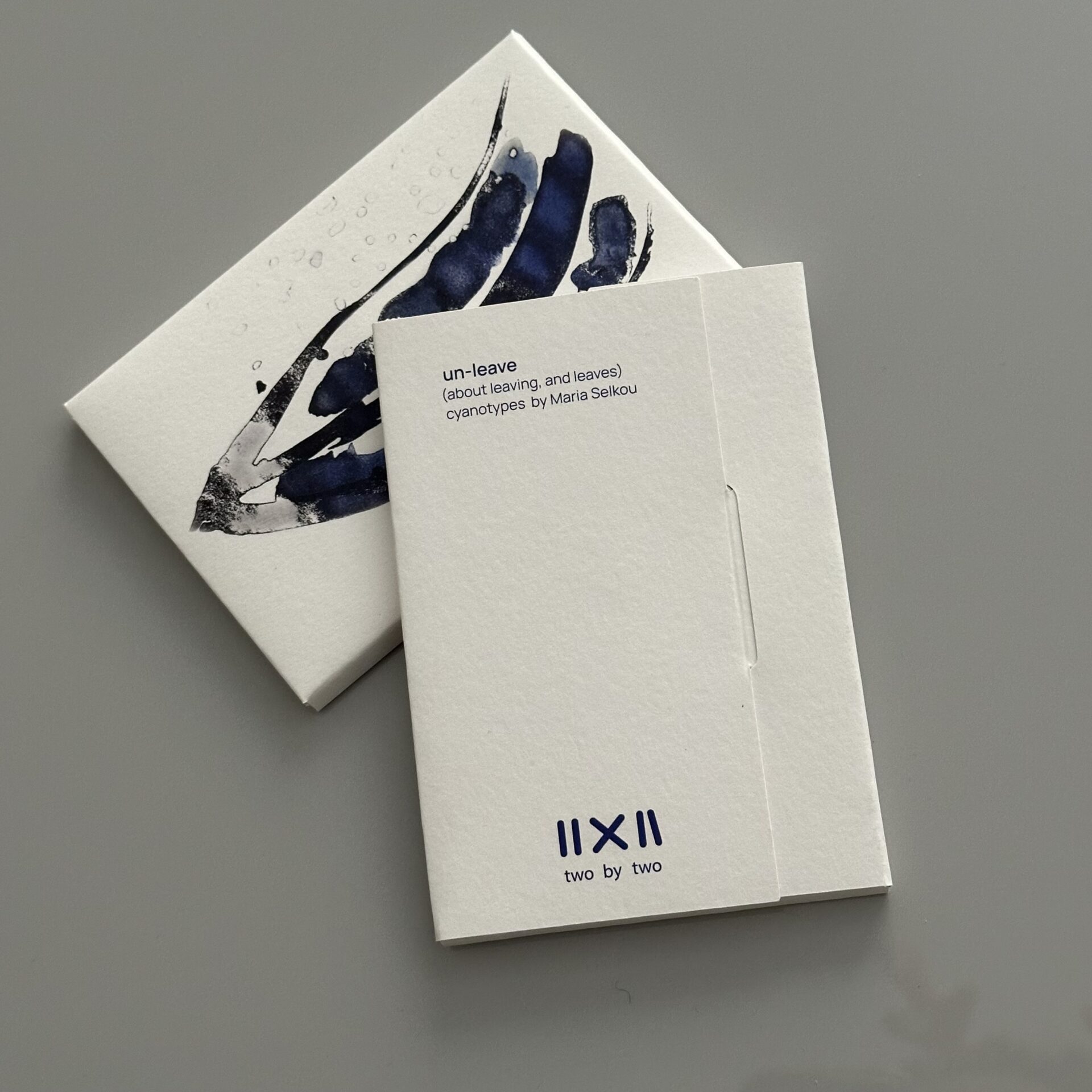 Το αποτέλεσμα, δύο κασετίνες -με αναφορές στις παλιές καρτ ποστάλ- τυπωμένες σε διάσταση 9×13 εκ.: η “Un-leave” με 10 αναπαραγωγές κυανοτυπιών της Μαρίας και η «Έρως Θέρος Φως» με 10 φωτογραφίες του Χρήστου. Στόχος τους, όπως τονίζουν, είναι να δημιουργήσουν χειροποίητα αντικείμενα, που, εκτός της εικαστικής απόλαυσης, να έχουν χρηστική διάσταση. «Προτιμήσαμε την υλικότητα του χαρτιού από την οθόνη του υπολογιστή. Θελήσαμε οι κυανοτυπίες και οι φωτογραφίες μας να αφηγηθούν μια ιστορία».