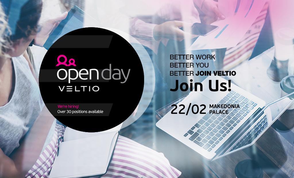Open Day, 22/02/2018: Αν μετά από αυτά που διάβασες εδώ η περιέργεια σου έχει ήδη οξυνθεί για το τι συμβαίνει σε αυτή τη γωνιά της πόλης τότε αυτό σε ενδιαφέρει πολύ. Στο πλαίσιο του εξωστρεφούς χαρακτήρα της εταιρίας και της συνεχής αναζήτησης, προσέλκυσης και απορρόφησης ταλαντούχου ανθρώπινου δυναμικού, η Veltio προσκαλεί αποφοίτους αλλά και έμπειρους επαγγελματίες από το χώρο της Πληροφορικής και του IT Consulting στο 1ο Veltio Recruitment Open Day στη Θεσσαλονίκη, τη Πέμπτη 22 Φεβρουαρίου στο Makedonia Palace. Κατά τη διάρκεια του Open Day η Veltio θα δώσει την ευκαιρία στους ενδιαφερόμενους να συμμετέχουν στην διαδικασία των συνεντεύξεων και να φτάσουν την ίδια ημέρα στο τελικό στάδιο αυτό της συνέντευξης με τον CEO της εταιρίας, αλλά και να δεχτούν άμεσα προσφορά εργασίας. Οι δηλώσεις συμμετοχής θα πρέπει να γίνονται ηλεκτρονικά μέσω της πλατφόρμας η οποία είναι αναρτημένη στο site της εταιρίας. Αντίστοιχη ενημέρωση για συγκεκριμένη ώρα προσέλευσης των υποψηφίων και περαιτέρω στοιχεία σχετικά με την διαδικασία θα στέλνονται στους υποψηφίους μέσω e-mail από το HR Department.