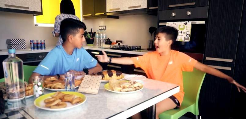 Η μαμά έχει ετοιμάσει ένα πλούσιο πρωινό , τα παιδιά κάθονται στο τραπέζι και αρχίζει διάλογος για το τρέξιμο και το σχολείο.