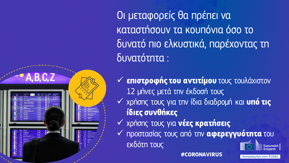 Πιο συγκεκριμένα σε ό,τι αφορά τις αερομεταφορές, η Κομισιόν προτείνει η διάρκεια των voucher, που οι αεροπορικές εταιρείες δίνουν έναντι των ματαιωμένων πτήσεων της προηγούμενης περιόδου, να παραταθεί για τουλάχιστον έναν χρόνο, με ενεργοποιημένη την προστασία έναντι πτώχευσης, ώστε οι δικαιούχοι να τα αποδέχονται χωρίς να ζητούν πλήρη αποζημίωση από αεροπορικές εταιρείες και τουριστικά γραφεία. Η Κομισιόν προτρέπει τις αεροπορικές εταιρείες να καταστήσουν περισσότερο ελκυστικά τα voucher παρατείνοντας την διάρκειά τους, προσφέροντας τους ίδιους με την αρχική κράτηση όρους ή αν είναι δυνατόν αναβαθμίζοντάς τους. Ορισμένα voucher πρέπει να μπορούν να είναι μεταβιβάσιμα και αυτομάτως αποπληρωτέα, αν δεν χρησιμοποιηθούν εντός του έτους.
